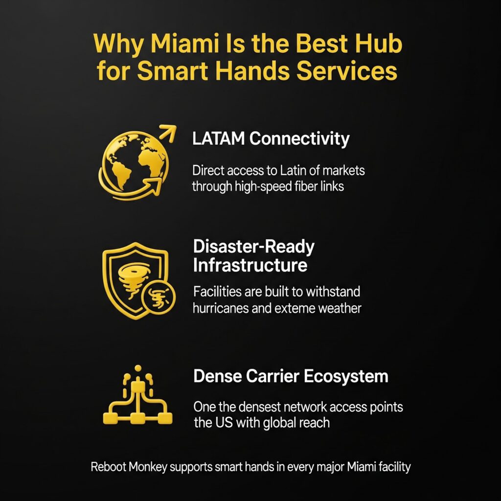 Miami’s location offers unique advantages for smart hands services Miami data center operations. The city serves as a natural bridge between North and South America, making it ideal for businesses with global operations.