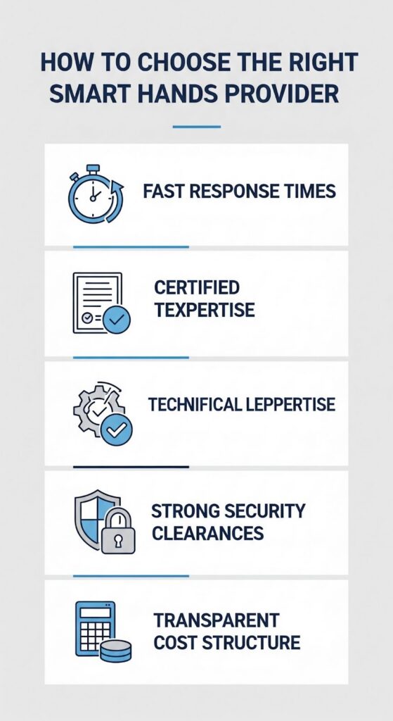 | Selecting the optimal smart hands provider requires evaluating response times, technical expertise, security clearances, and cost structures to ensure alignment with your specific business requirements and service level expectations. |