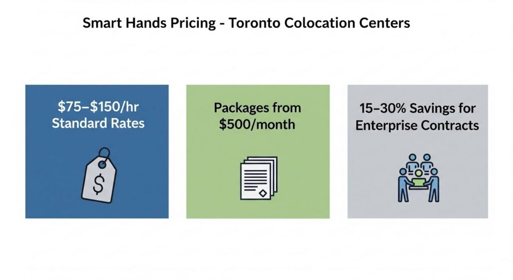 Smart hands toronto colocation center price typically ranges from $75-$150 per hour, with monthly packages starting around $500. Emergency and after-hours rates may include premium charges of 25-50%.