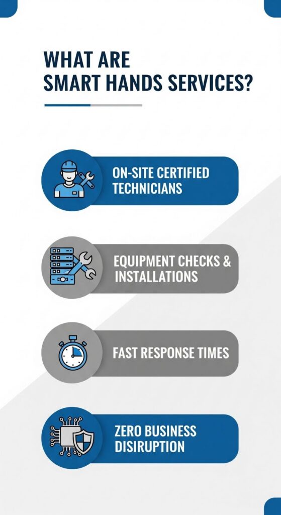 | Smart hands services are professional on-site technicians who perform physical tasks at colocation data centers on behalf of remote clients. These certified experts handle everything from basic equipment checks to complex installations, providing immediate response times that keep your business operations running without interruption. |