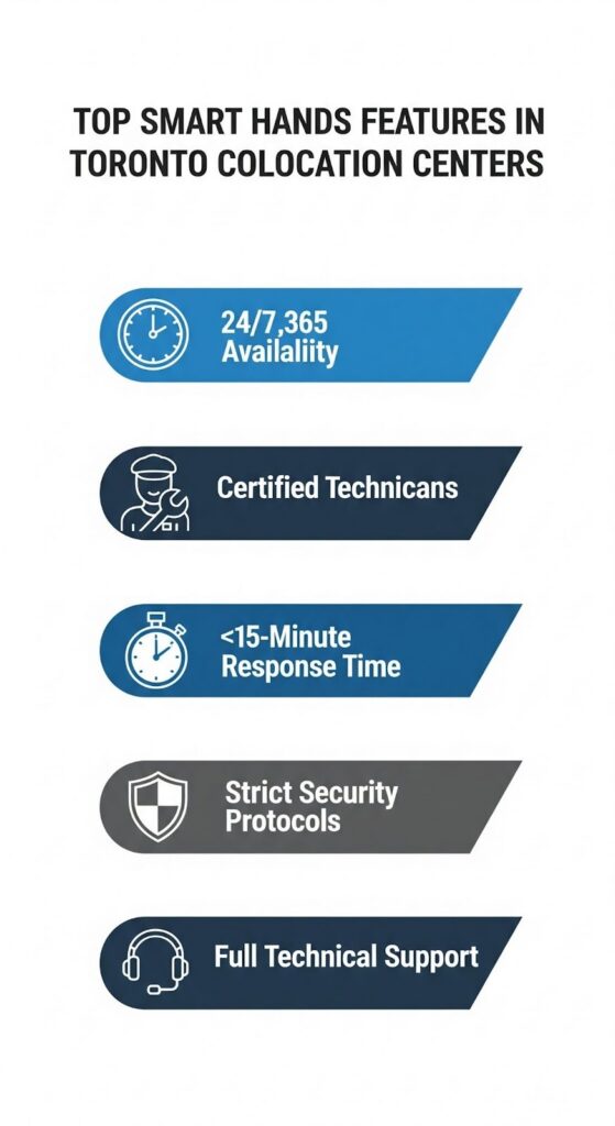 Most major smart hands toronto colocation center providers maintain round-the-clock staffing, though availability may vary by facility. Always confirm 24/7 coverage when selecting a provider for critical infrastructure.