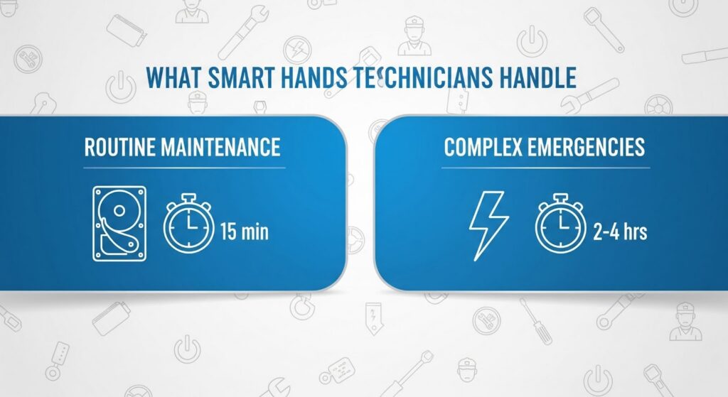 | Smart hands technicians handle everything from routine maintenance like replacing failed hard drives (15-minute tasks) to complex emergency situations like restoring power after equipment failures (2-4 hour procedures). |